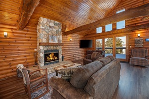 - **Living Area:** Comfortable seating, a wood-burning fireplace, and large windows boasting stunning lake views.